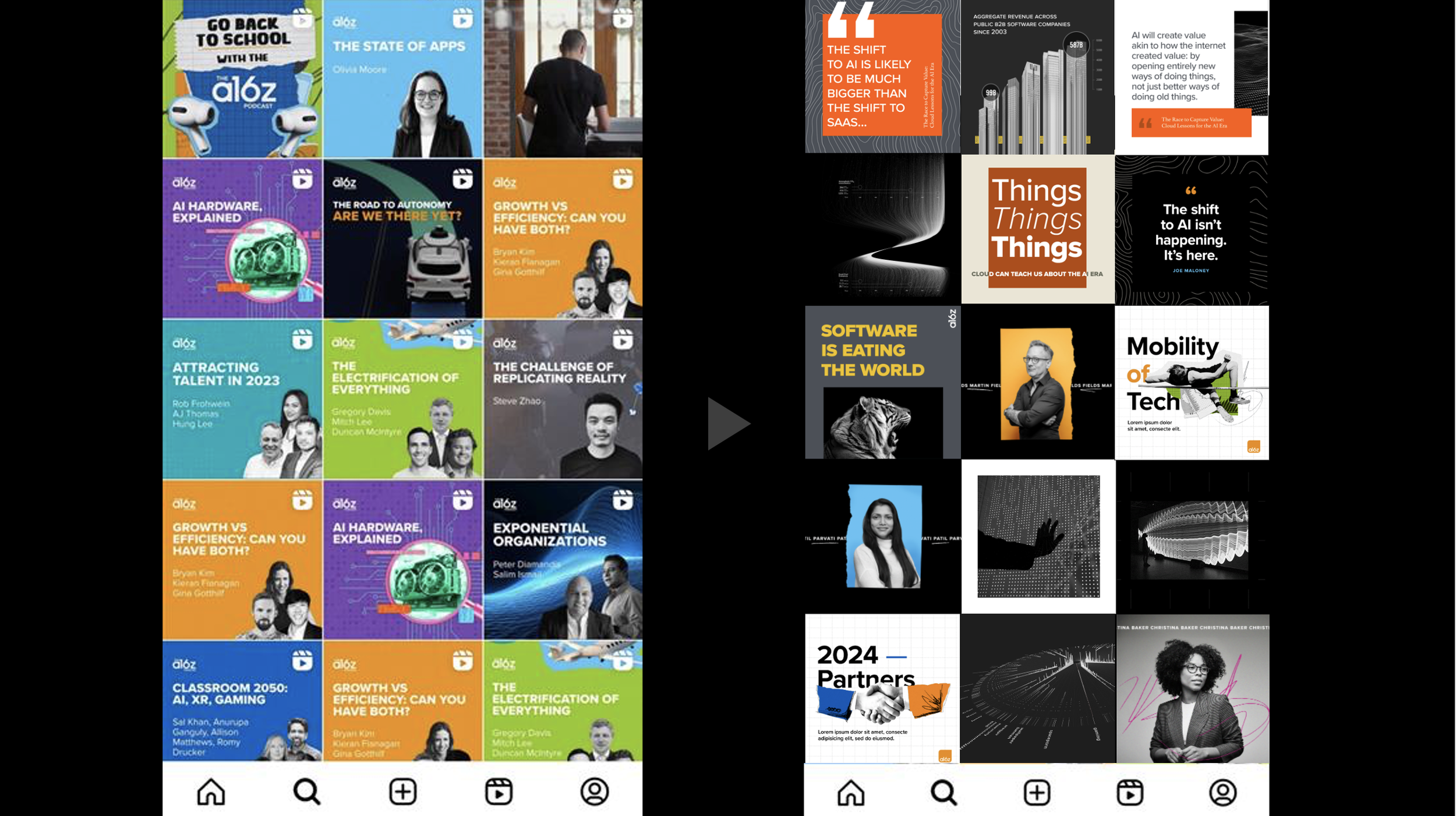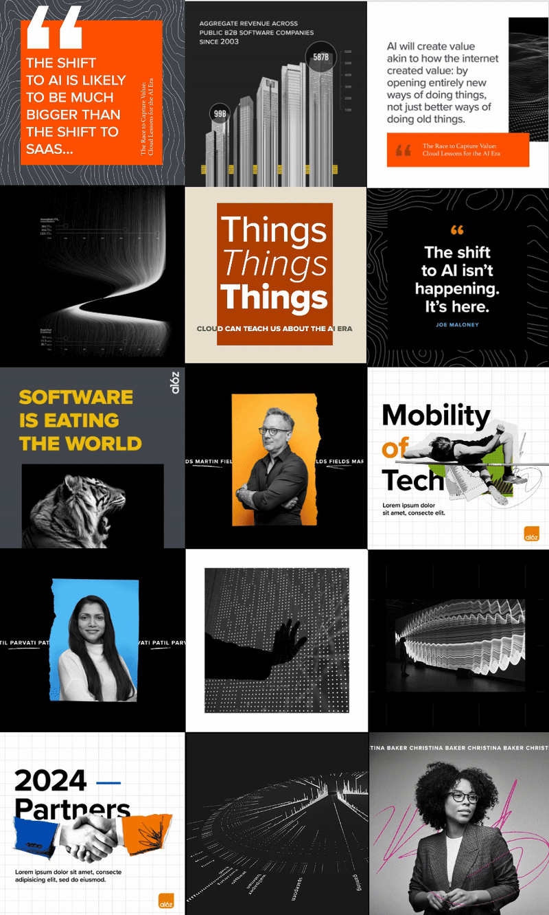 Andreessen Horowitz (aka a16z) is a $46B venture capital firm that was looking to overhaul their social strategy and had been in a long search for an agency to help them do so. I was brought in the afternoon before the pitch to make some creative mocks of posts, but upon further discussion with the strategy team, learned that the marketing team at a16z was unhappy with the look of their social and were craving a better design system to move forward with. While not part of the actual ask, I did a swift creative audit of their current Instagram account and created a reimagined, elevated version overnight in time for the pitch to clench the win. And with the client stipulation that I lead the account with my creative partner.
